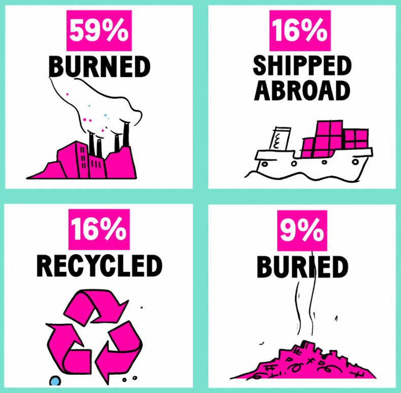 Over half (59%) of our household plastic waste is being burnt here in the UK. Only 16% actually ends up being recycled. Another 16% is exported and 9% is buried in landfill.